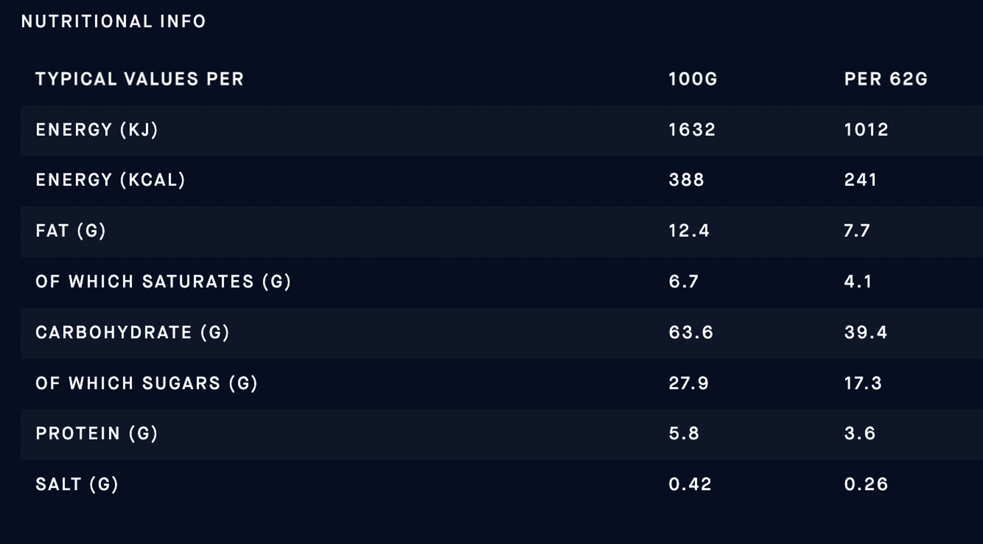 Great tasting easily digested bar that contains over 39g of carbohydrate per bar.